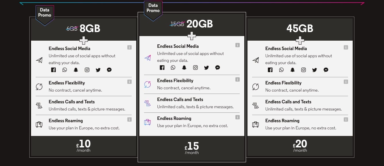 They have multiple plans, all of which come with Unlimited Social Media, Endless Calls and Texts and no contract. Last time we checked prices started at a very reasonable £10 per month.